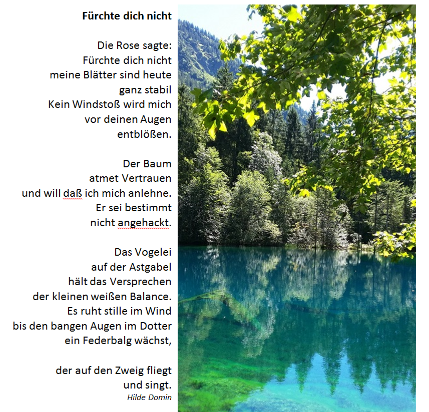 Unter anderem aus dieser Haltung resultieren wohl die Kraft, Dichte und Intensität ihrer Sätze und Gedichte. Noch heute – oder eventuell sogar besonders heute, in der aktuellen Situation – können sie gleichwohl zum „An-Andere“-Denken anregen und zum Mut-Schöpfen einladen. Und vielleicht ja so auch das eine oder andere kleine Alltags-Wunder in unseren Zeit entstehen lassen…